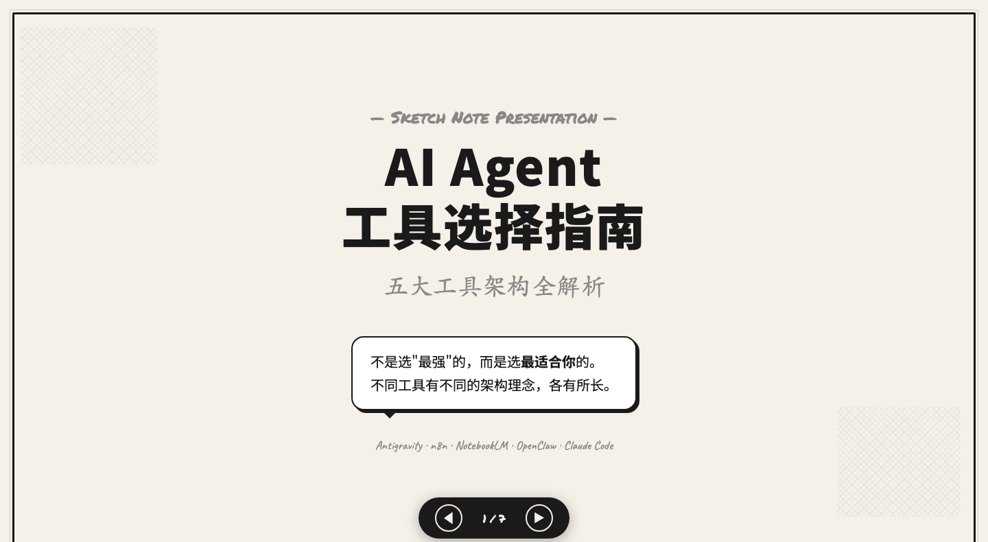 於是我試了一下。直接告訴 AI:「用 HTML 幫我生成一份黑白漫畫塗鴉風格的 Sketch Notes PPT,關於 AI Agent 工具選擇指南。」