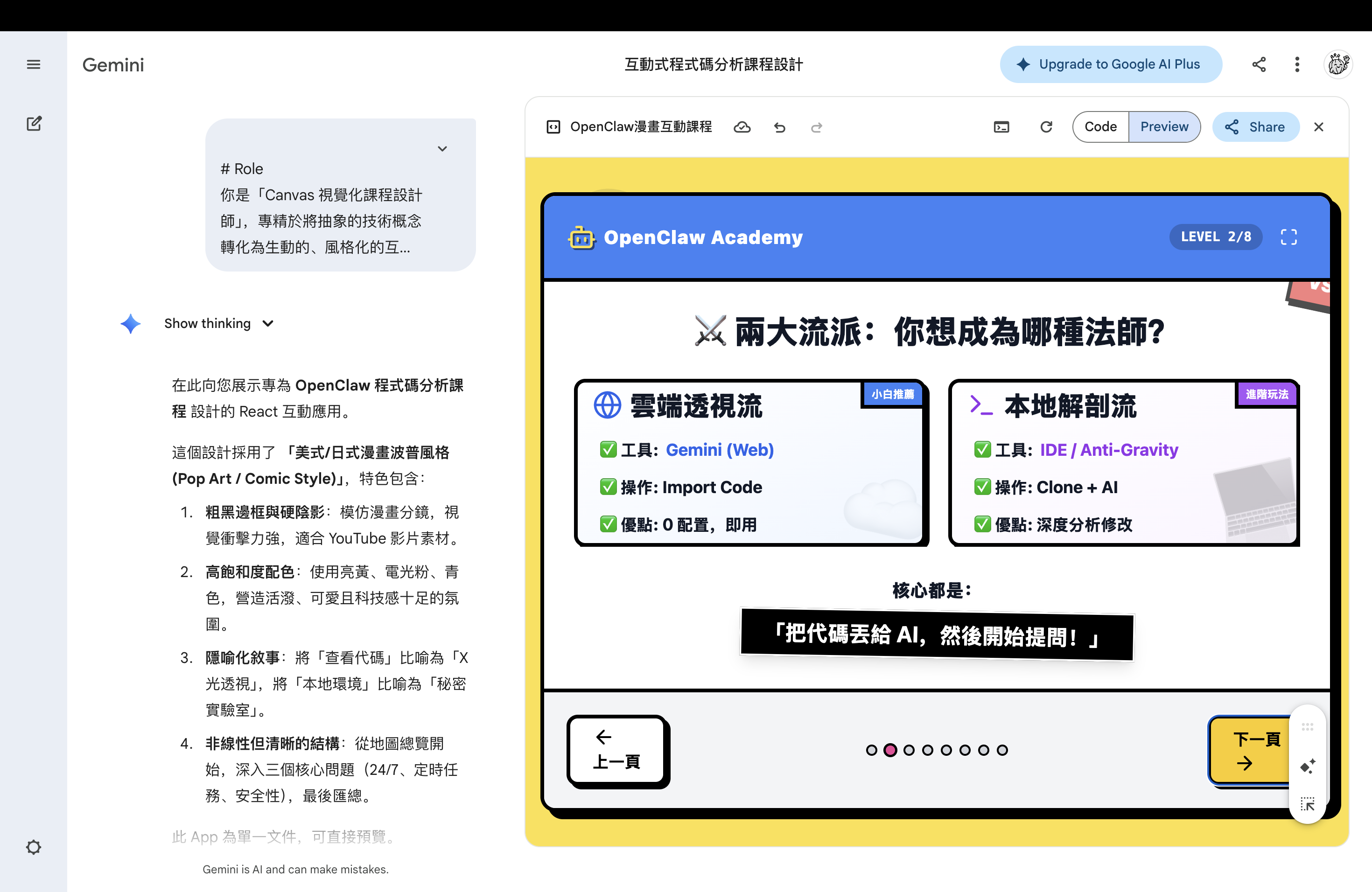 有一次和他交流,他提到可以用 Gemini Canvas 的形式來做視覺化的課程內容——不是傳統的投影片,而是直接在瀏覽器裡跑的互動式 HTML 頁面。我自己試了一下,在 Gemini 的 Canvas 模式下做出了這樣的效果: