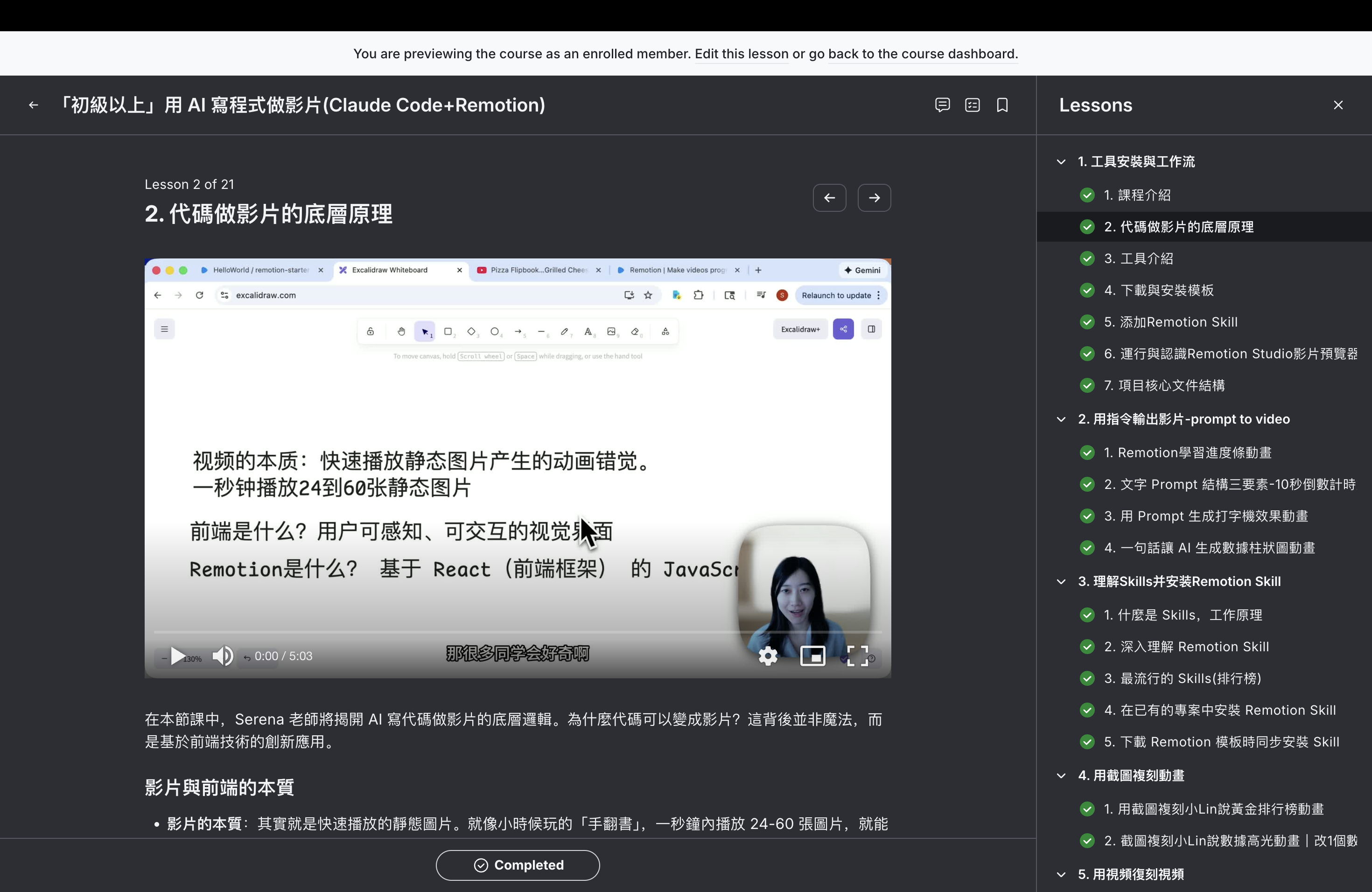 Serena 開了一門課叫《用 AI 寫程式做影片》,用的工具叫 Remotion——基於 React 的框架,把代碼直接渲染成影片。她課程裡的一句話讓我印象很深: