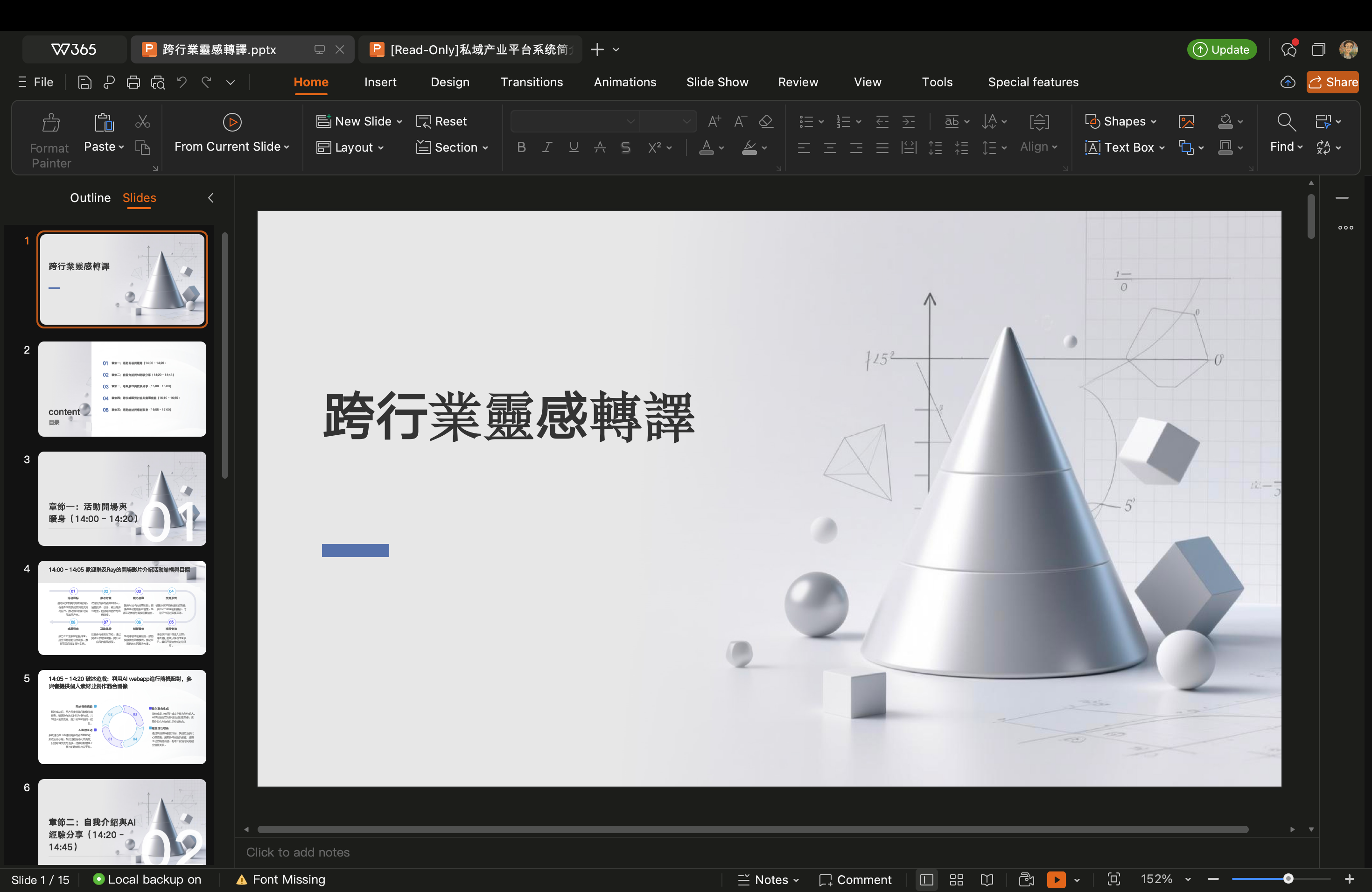 我試過用阿里的 AI 工具直接生成投影片。受限於網頁介面和模型本身,無論是動態效果還是字體選擇,都有相當大的限制。生成出來的效果——3D 幾何體、白色漸層背景、字體還顯示缺失——打開了又關掉,改了又改,最後花掉的時間並不比自己做少。